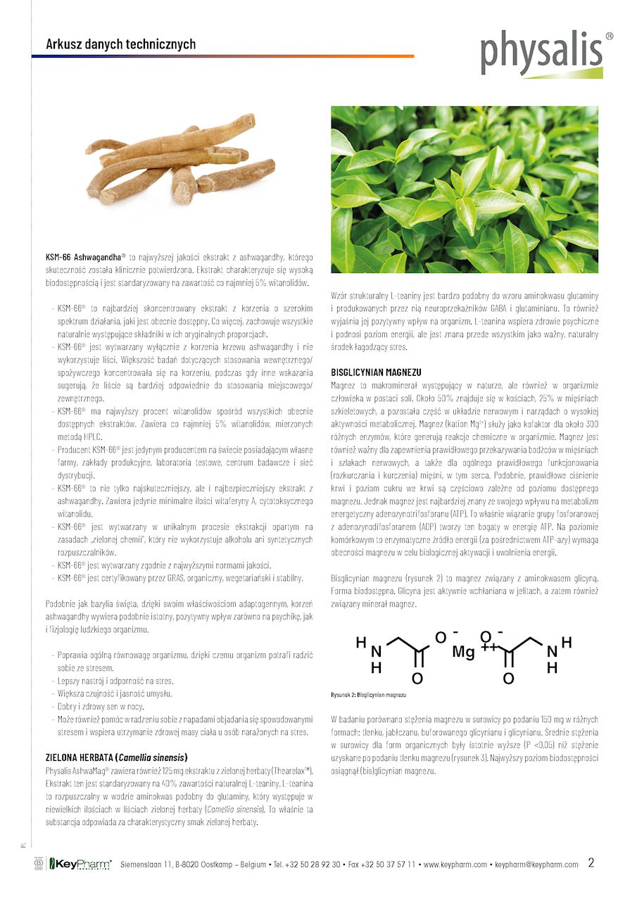 Physalis AshwaMag® łączy w sobie zalety dwóch roślin ajurwedyjskich, które mogą zapewnić naturalne wsparcie dla naszego często stresującego stylu życia. Ten zaawansowany kompleks zawiera KSM-66®, najwyższej jakości ekstrakt z ashwagandhy lub indyjskiego żeń-szenia o wysoce standaryzowanej zawartości witanolidów (5 %). Physalis AshwaMag® zawiera również innowacyjny ekstrakt z bazylii świętej lub tulsi (Ocimum tenuiflorum, Holixer™) z pięcioma bioaktywnymi związkami, które tworzą kompleks bioaktywny Ocimum. Bazylia święta i ashwagandha wspomagają w przypadku stresu i napięcia. Ashwagandha przyczynia się również do dobrego, zdrowego snu w nocy. Zawiera również Thearelax®, ekstrakt z zielonej herbaty standaryzowany na 40 % naturalnej L-teaniny. Wreszcie, ten kompleks zawiera dwie łatwo przyswajalne formy magnezu: bisglicynian magnezu i magnez morski z bogatej w minerały wody morskiej (Aquamin®Mg). Oba pomagają zmniejszyć zmęczenie.