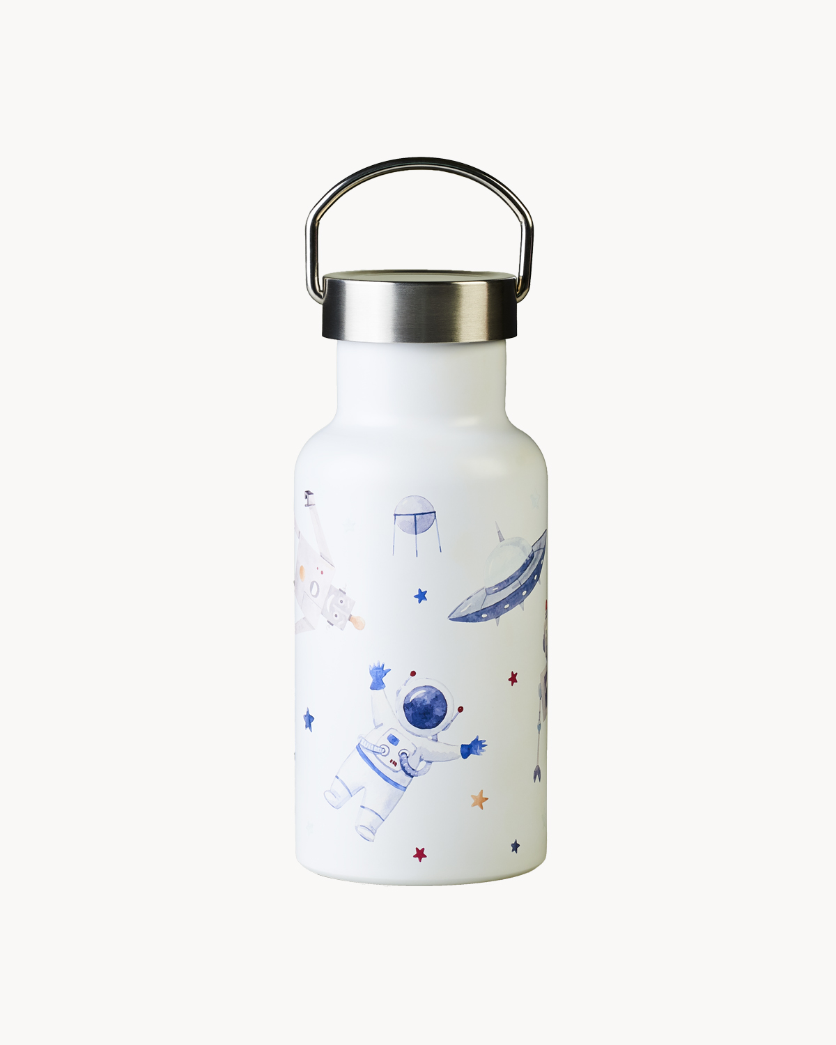 OPIS - Butelka termiczna ze stali nierdzewnej - Idealne rozwiązanie dla małych, dziecięcych rączek - Pojemność 350 ml - Utrzymuje temperaturę zimnych płynów do 24 godzin - Utrzymuje temperaturę ciepłych płynów do 12 godzin - Posiada dwie nakrętki: stalowa nakrętka do podróży oraz ustnik z tworzywa PLA ze słomką do picia - Do zestawu dołączony czyścik - Dzięki wbudowanemu uchu w zakrętce można ją przymocować do wózka lub torby - Nadaje się do napojów gazowanych - Zalecane mycie ręczne - Nie nadaje się do używania w mikrofali - Produkt wielokrotnego użytku
