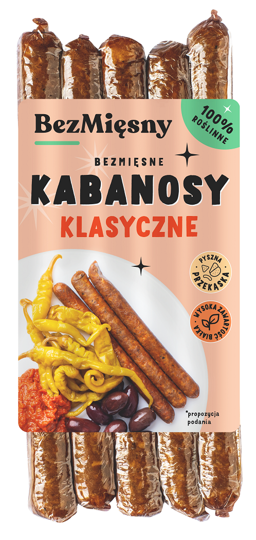 Bezmięsna przekąska o smaku kabanosa z dodatkiem soli kłodawskiej i czarnego pieprzu. Produkt roślinny na bazie białka pszennego i grochowego.