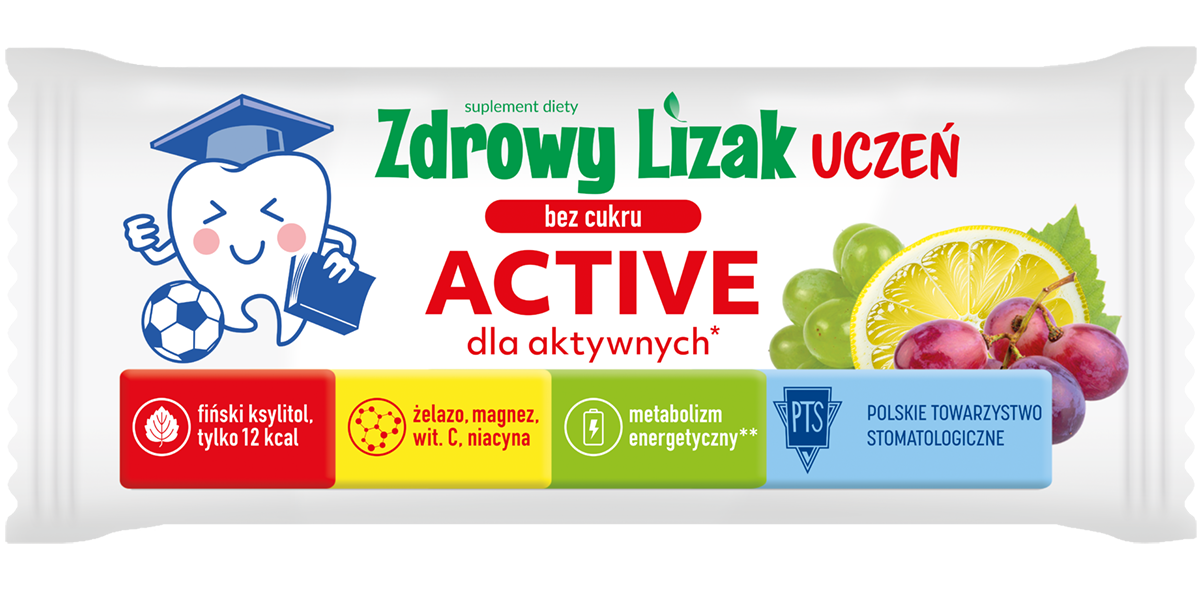 Suplement diety Zdrowy Lizak UCZEŃ ACTIVE to nowy lizak stworzony z myślą o dzieciach w wieku szkolnym polecany do spożycia w okresie wzmożonego wysiłku fizycznego.