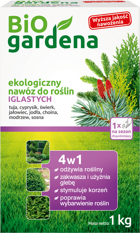 Nawóz doglebowy odżywiający rośliny w azot i siarkę, przeznaczony do roślin iglastych preferujących niskie pH gleby (tuja, cyprysik, świerk, jodła, sosna, modrzew). Stosować od wczesnej wiosny do końca lata, raz w sezonie.