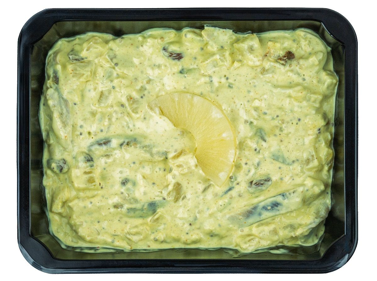 Filet ŚLEDZIOWY solony 30 % (ŚLEDŹ, sól), majonez (olej rzepakowy 80 %, żółtko JAJA 6 %, ocet spirytusowy, cukier, sól, GORCZYCA, ekstrakty przypraw, regulator kwasowości: kwas cytrynowy, przeciwutleniacz: E 385), GORCZYCA, ananas w zalewie 28 % (ananas, woda, cukier, regulator kwasowości: kwas cytrynowy), cebula, rodzynki, miód, przyprawy.