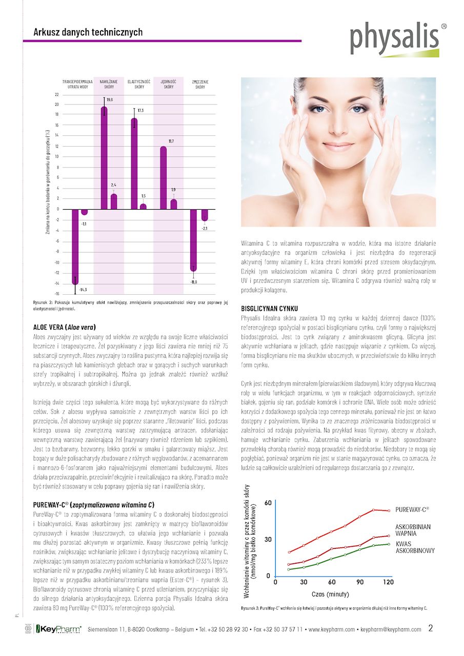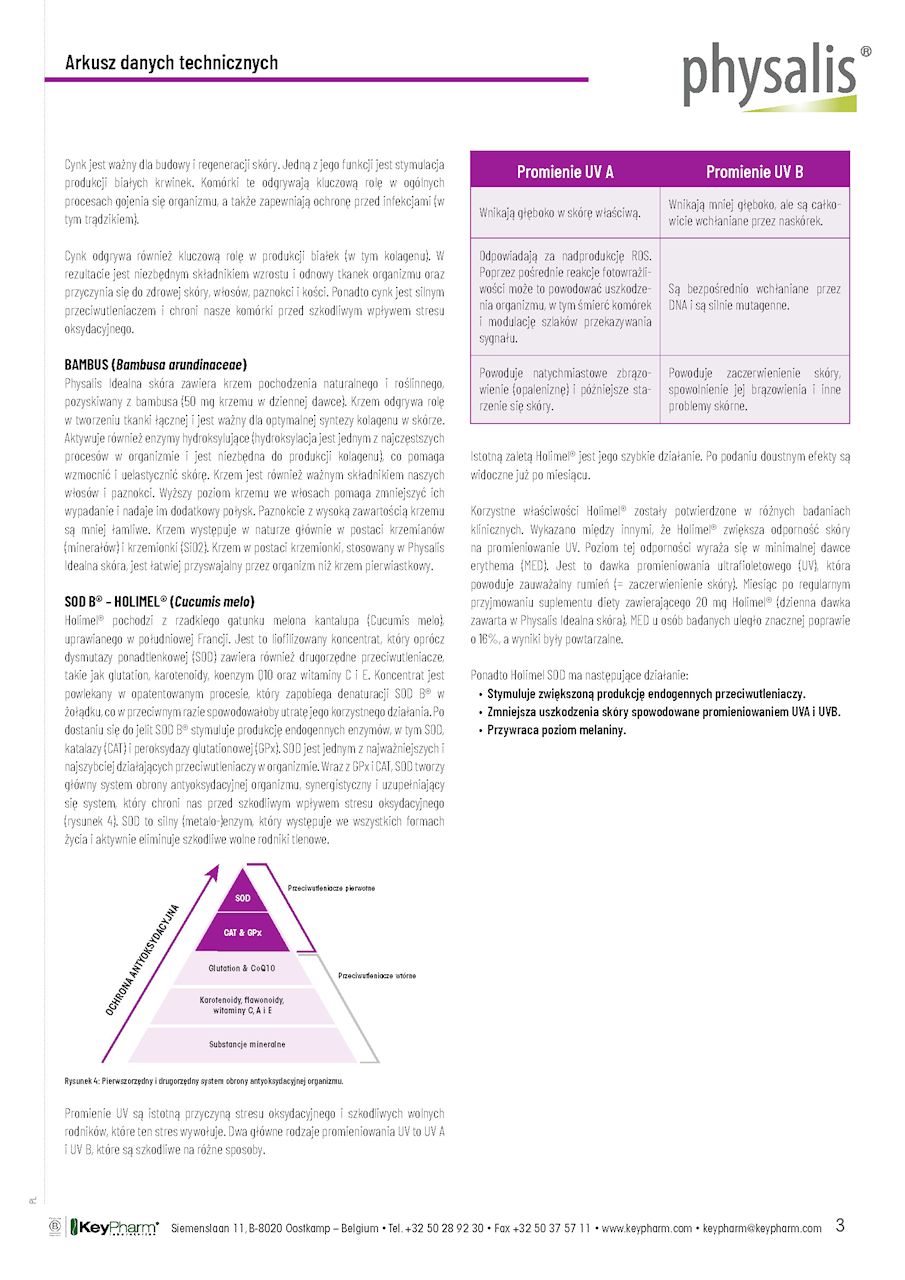 Wąkrota azjatycka przyczynia się do dobrego krążenia krwi w skórze. Ponadto Physalis Perfect Skin zawiera witaminę C (PureWay-C®), która wspomaga prawidłową syntezę kolagenu. Witamina C, cynk i aloes dodatkowo przyczyniają się do ochrony komórek przed wolnymi rodnikami. Na koniec, kompleks ten zawiera również Holimel®, SOD (dysmutazę ponadtlenkową) pochodzącą z koncentratu francuskiego gatunku melona (Cucumis melo) i krzem roślinny pochodzący z bambusa. Nie należy przekraczać zalecanej porcji do spożycia w ciągu dnia. Suplement diety nie może być stosowany jako substytut zróżnicowanej diety i zdrowego trybu życia.