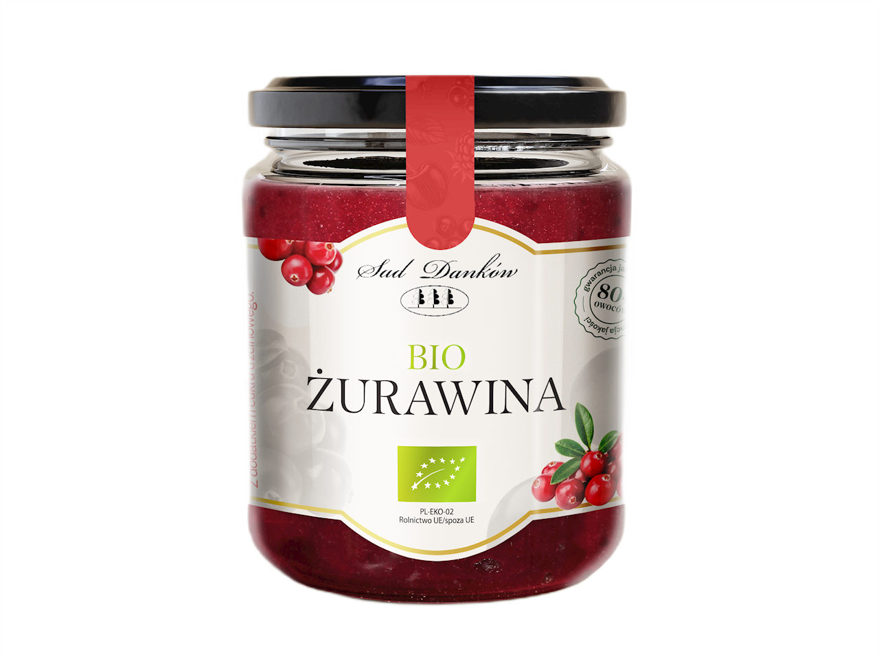 Ekologiczna żurawina, gotowana, pasteryzowana, bez dodanej wody z dodatkiem cukru trzcinowego.